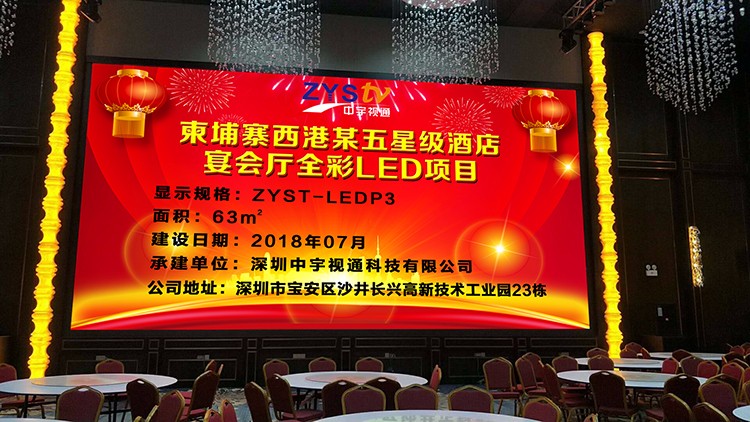柬埔寨西港某五星級酒店與中宇視通科技合作,宴會廳63平方P3全彩LED顯示屏項目安裝完成,整屏點亮并驗收完成。